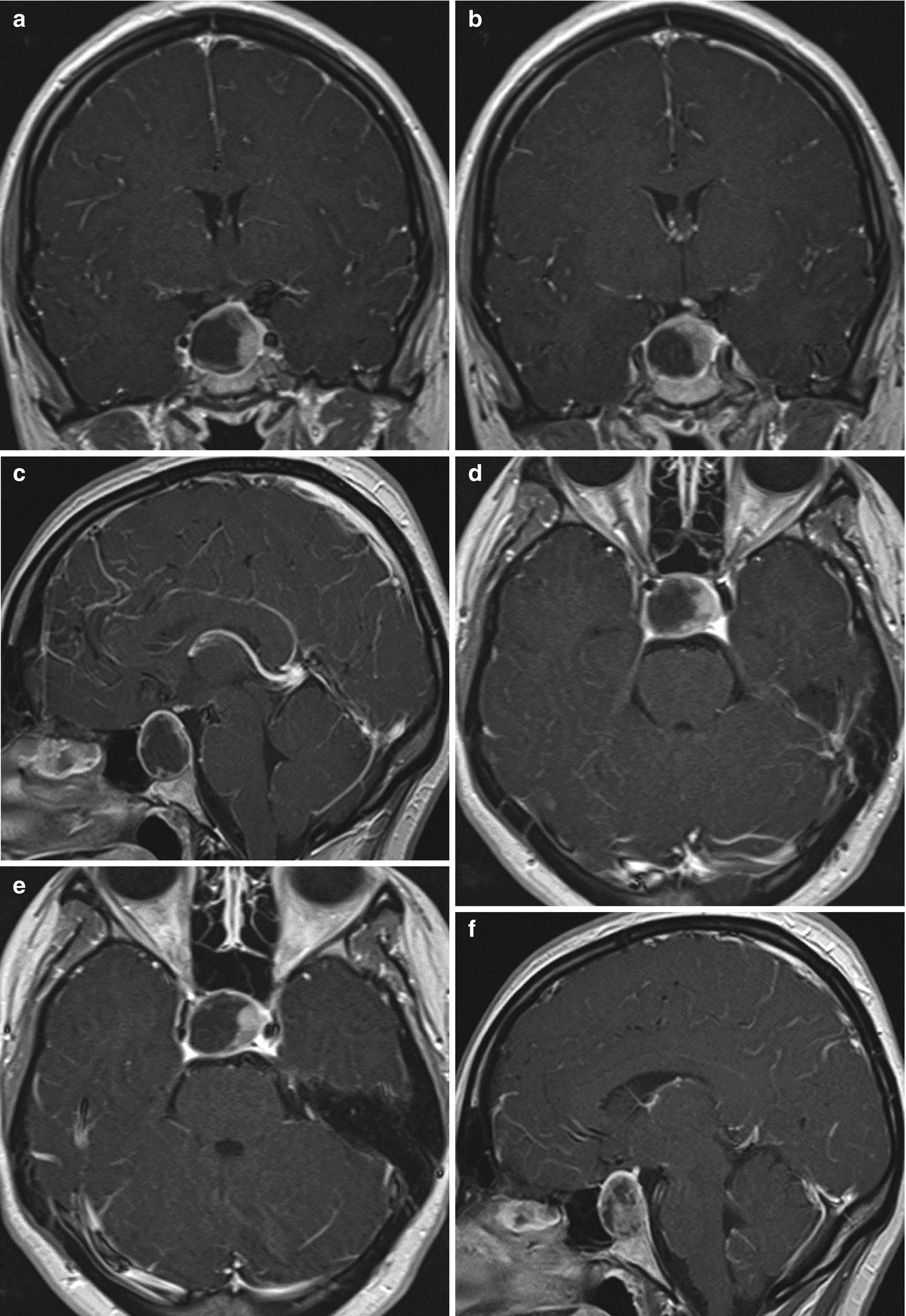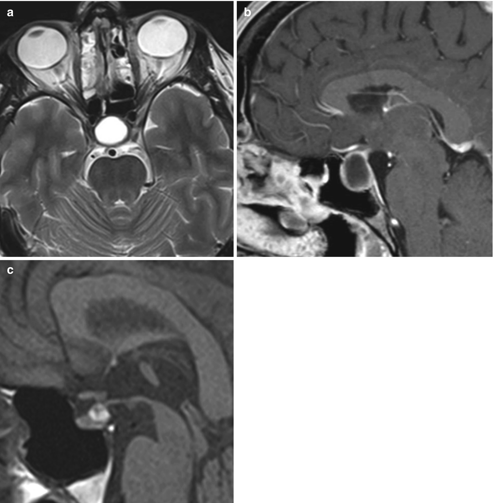 MRI T2-weighted axial image a T1-weighted post-gadolinium axial b and coronal images c demonstrate an extra-axial expansive lesion dotted circles mildly hyperintense with heterogenous contrast enhancement surrounded by cystic components. The presence of a fluid-fluid level a hypointense rim on T2-weighted images septation and an off-midline location were more common with pituitary adenomas whereas the presence of an intracystic nodule was more common with Rathke cleft cysts.